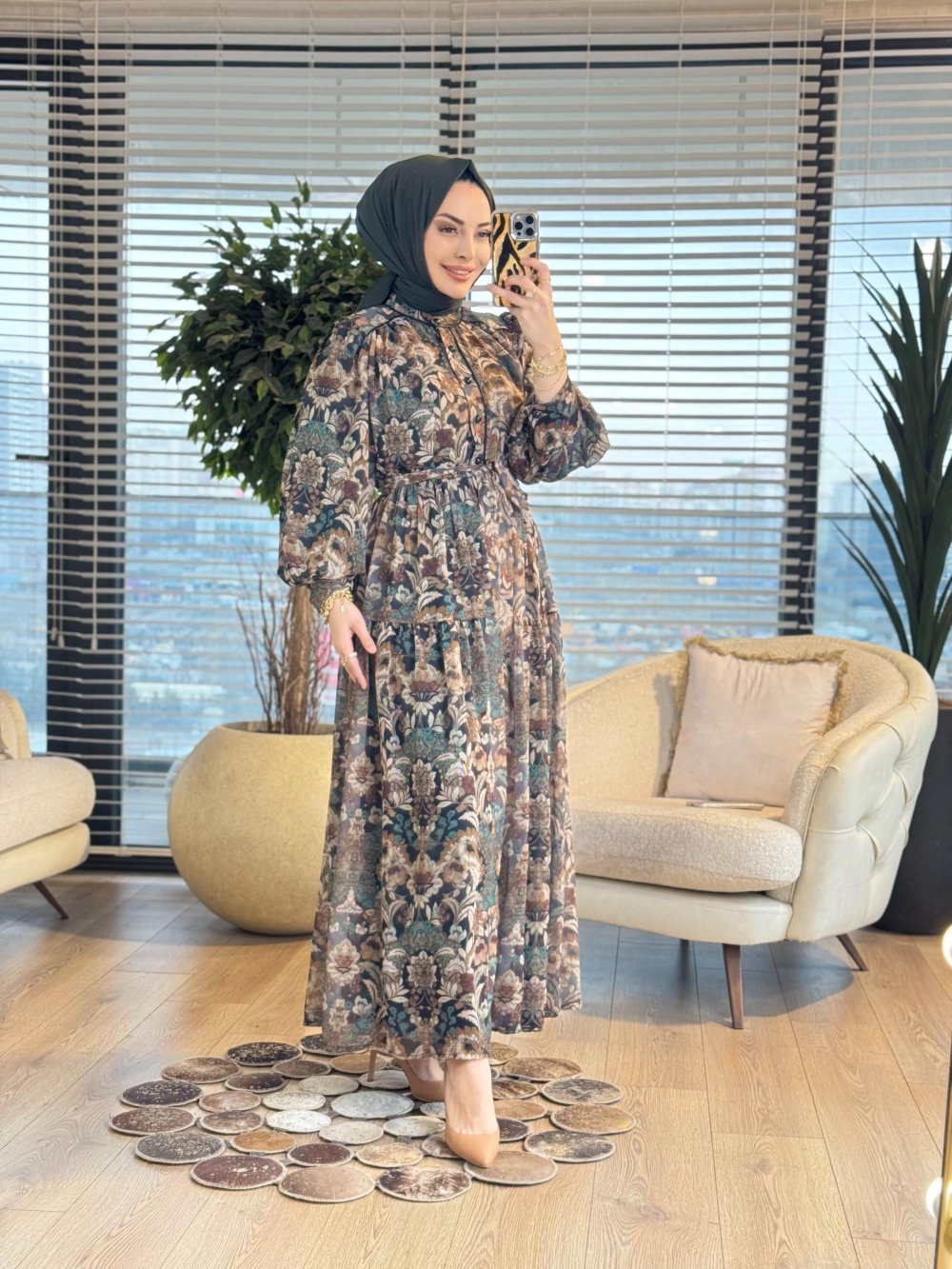 014 Şifon Üstü Karışık Çiçek Desen Elbise Zümrüt