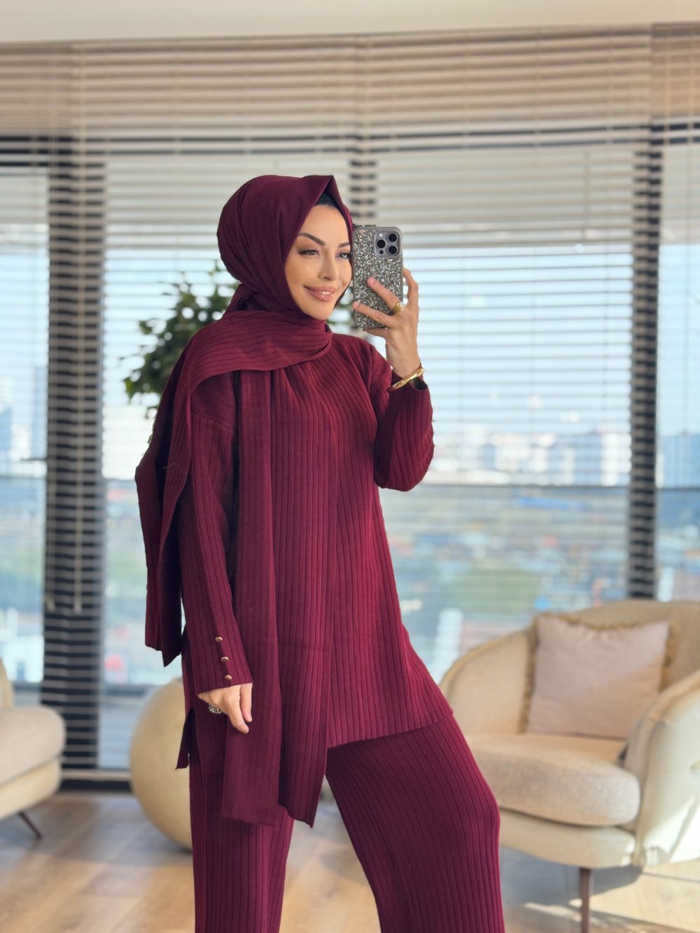 10017 Kolları Düğmeli Şallı Triko Takım Bordo