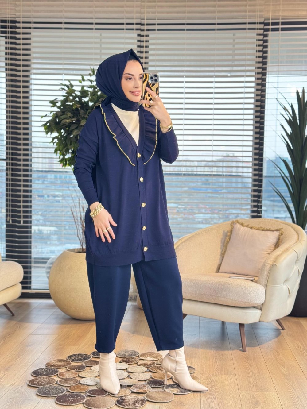 123 Yaka Kenarı Fırfır Detaylı V Yaka Hırka Lacivert