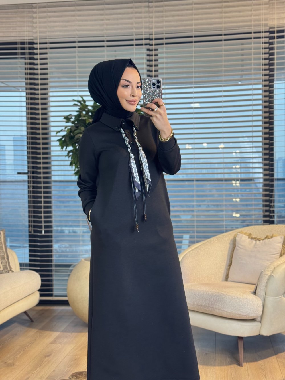 12669 Fularlı Patı Düğmeli Elbise Siyah