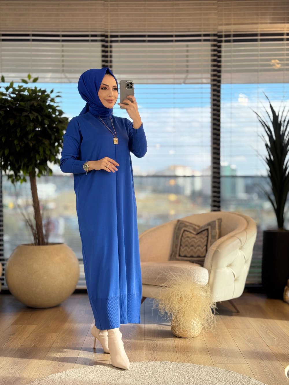 130 Önü Boyuna Çizgi Detaylı Triko Elbise İndigo