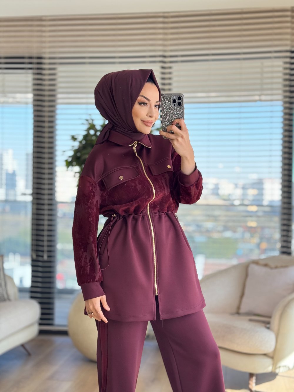 14400 Kol Ön Ve Pantolon Yanı Kadifeli Takım Bordo