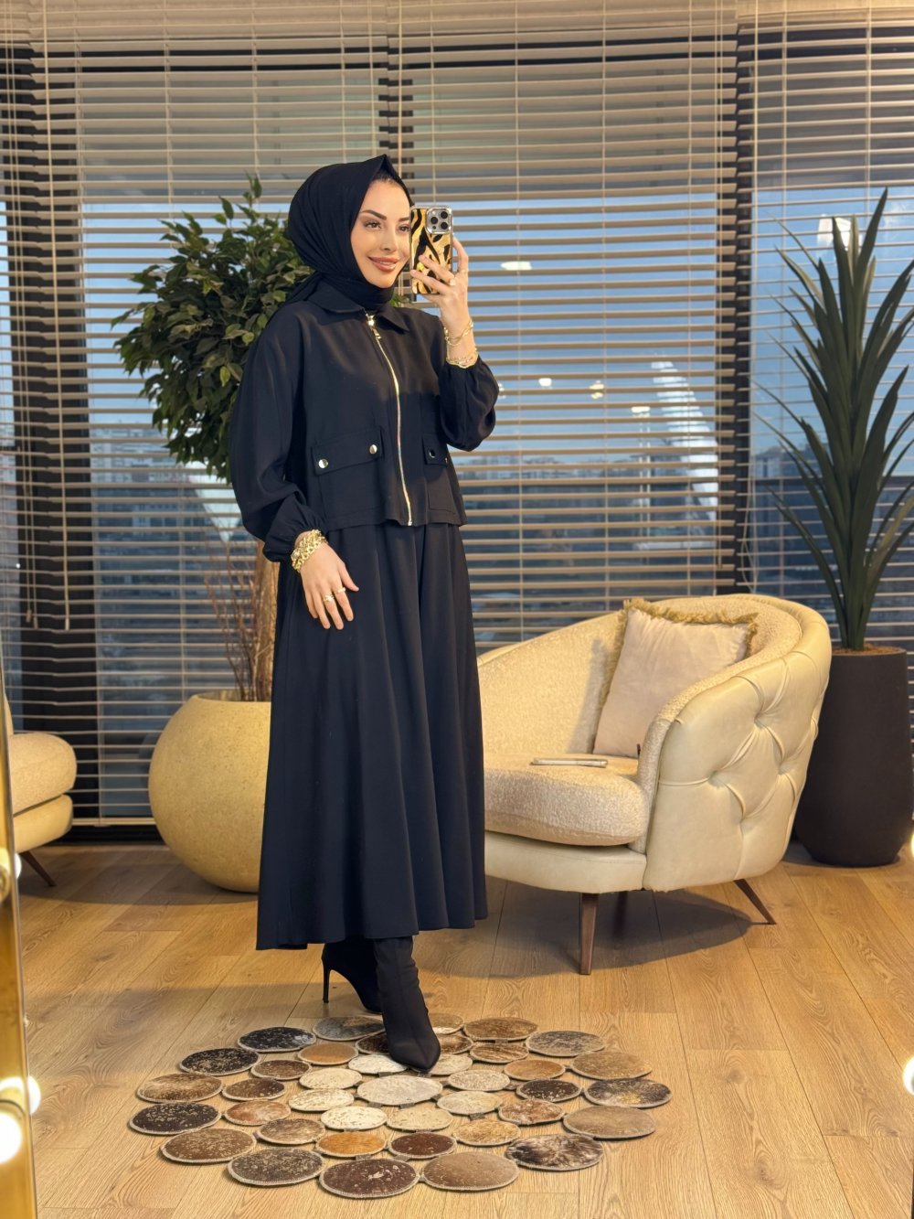 14436 Önü Cep Ve Fermuarlı Etekli Takım Siyah