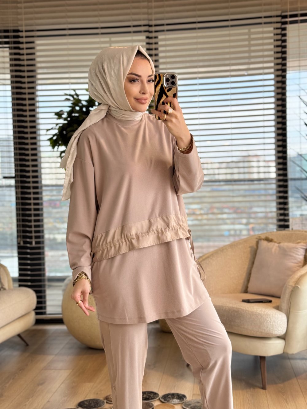 14456 Önü Saten Şerit Detaylı Takım Bej