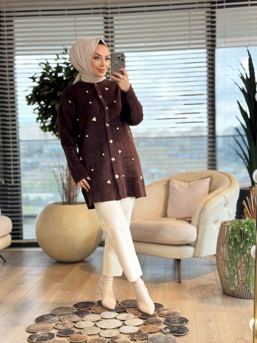 145120 Angora İnci Taş İşlemeli Hırka Kahve