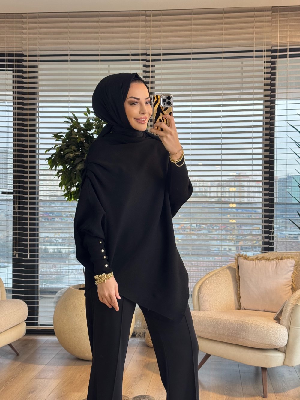 161  Asimetrik Omzu Drapeli Triko Tunik Siyah