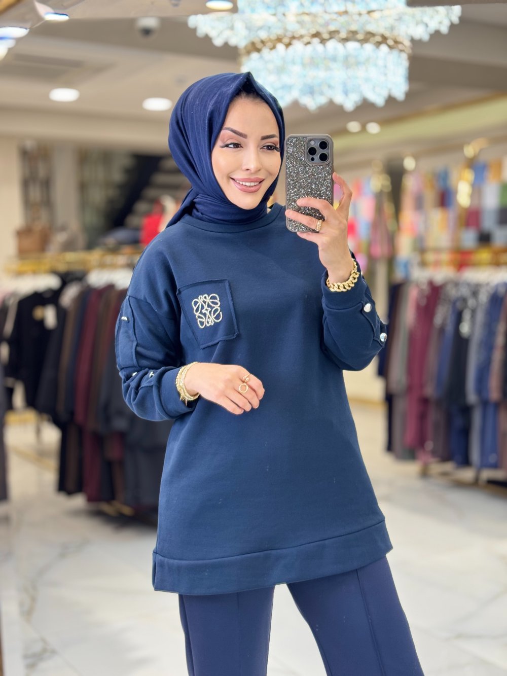 2136 Kolları Düğmeli Cebi Taş Baskılı Tunik Lacivert