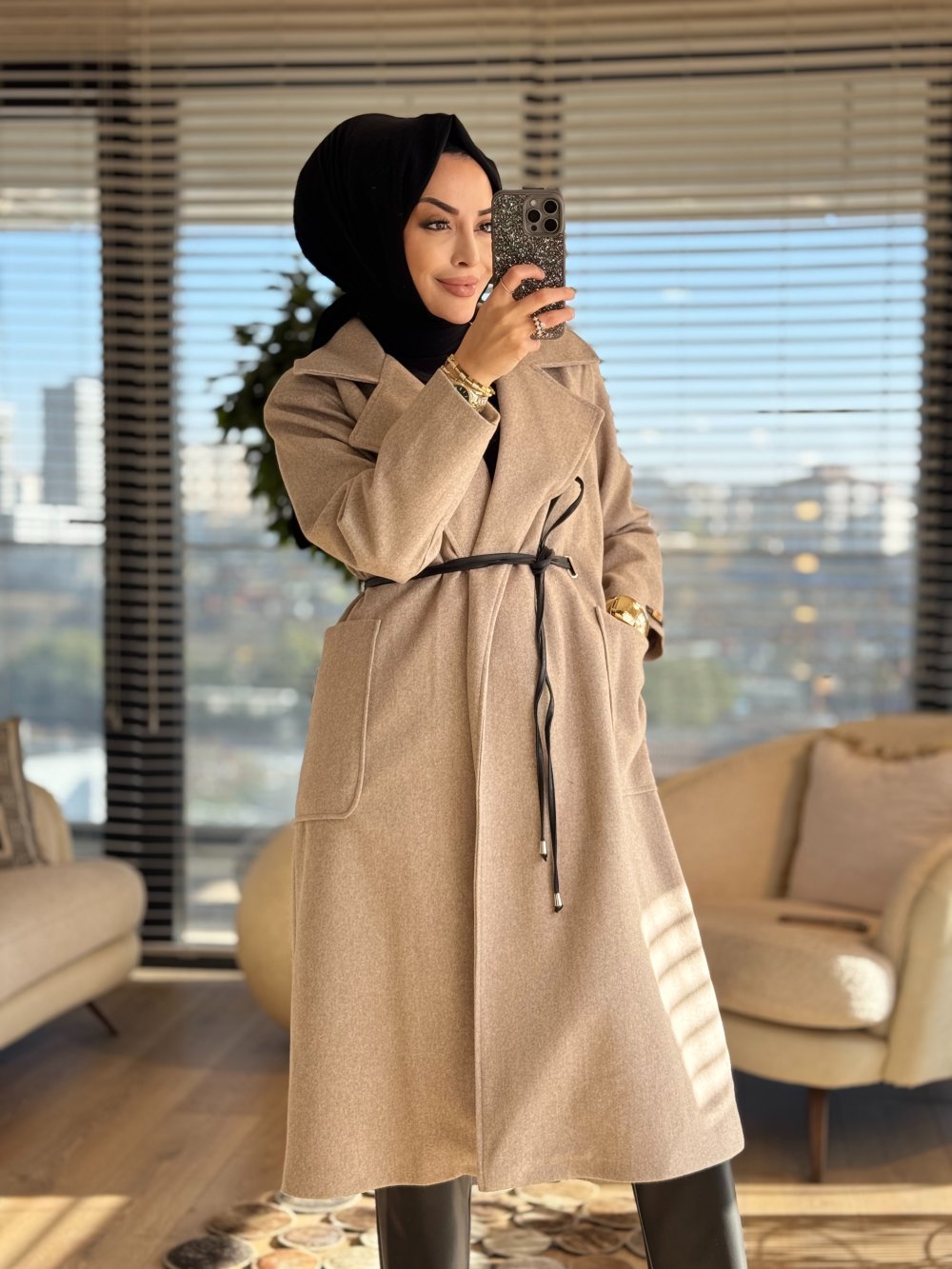 2189 Kaşe Deri Kemerli Uzun Kaban Bej