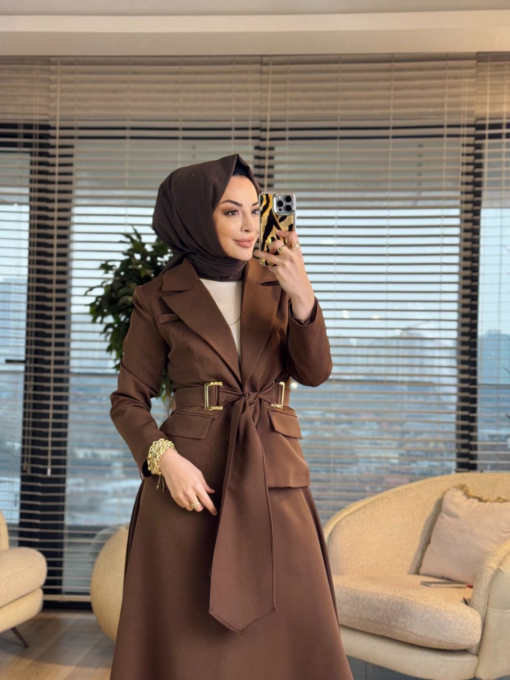 2194 İki Düğme Ceket Etekli Takım Kahve