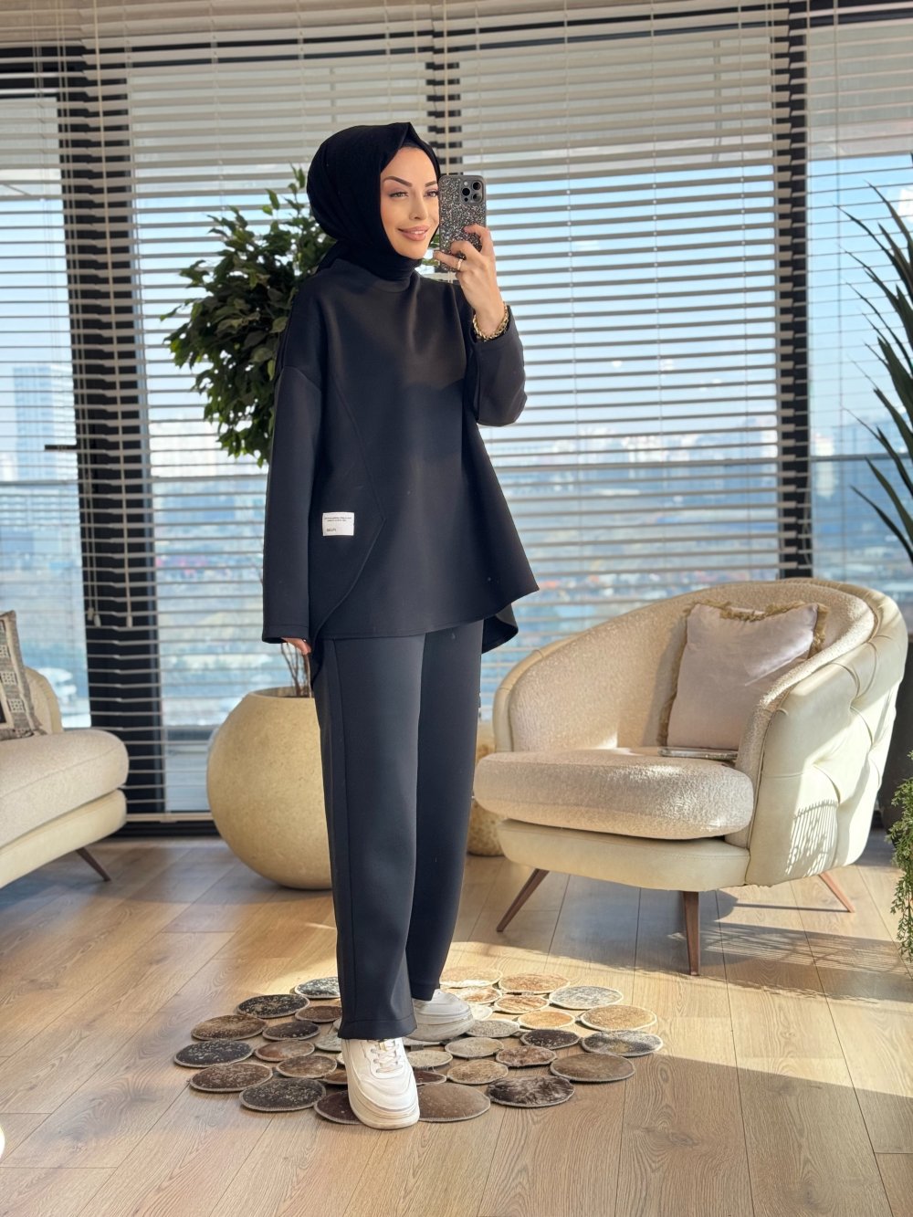 22809 Yanları Parça Ve Etiket Detaylı Takım Siyah