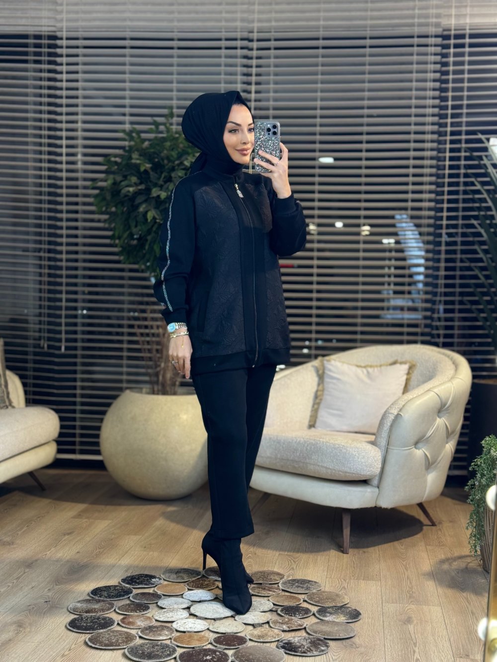 2402 Ön Kabartma Desenli Omuzları Zincirli Takım Siyah
