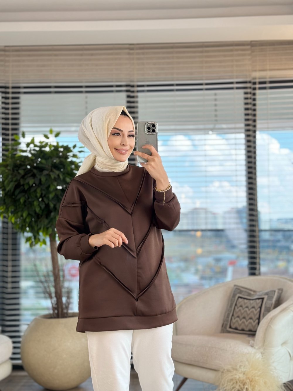 24034 Ön V Dikiş Parçalı Scuba Tunik Kahve