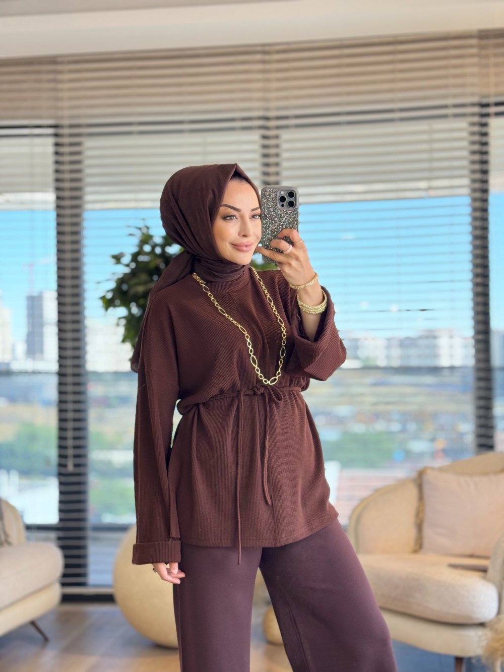 24357 Kendinden Çizgili Kolu Katlamalı Tunik Kahve