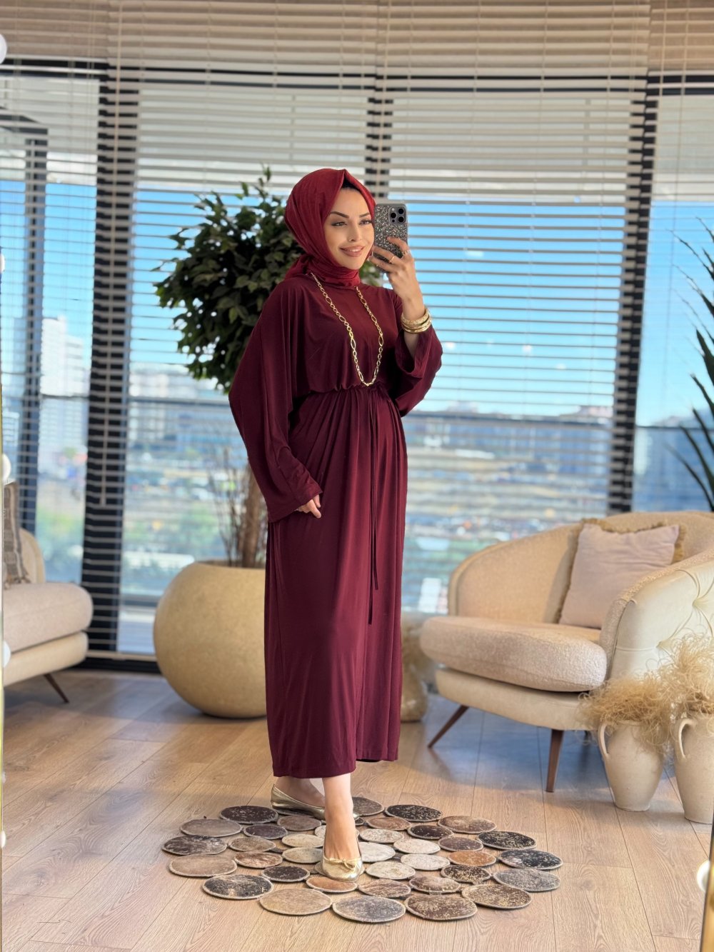25117 Belden Bağlamalı Elbise Bordo