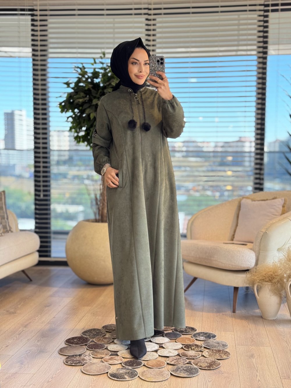 2571 Kolu Şeritli Süet Pardesü Haki