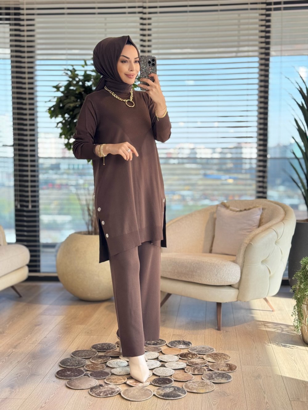 2583 Yanları Düğmeli Triko Takım Kahve