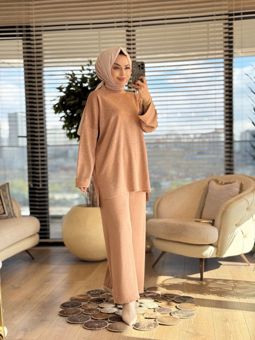 26240 Simli Triko Üstü Taş Baskılı Takım Latte