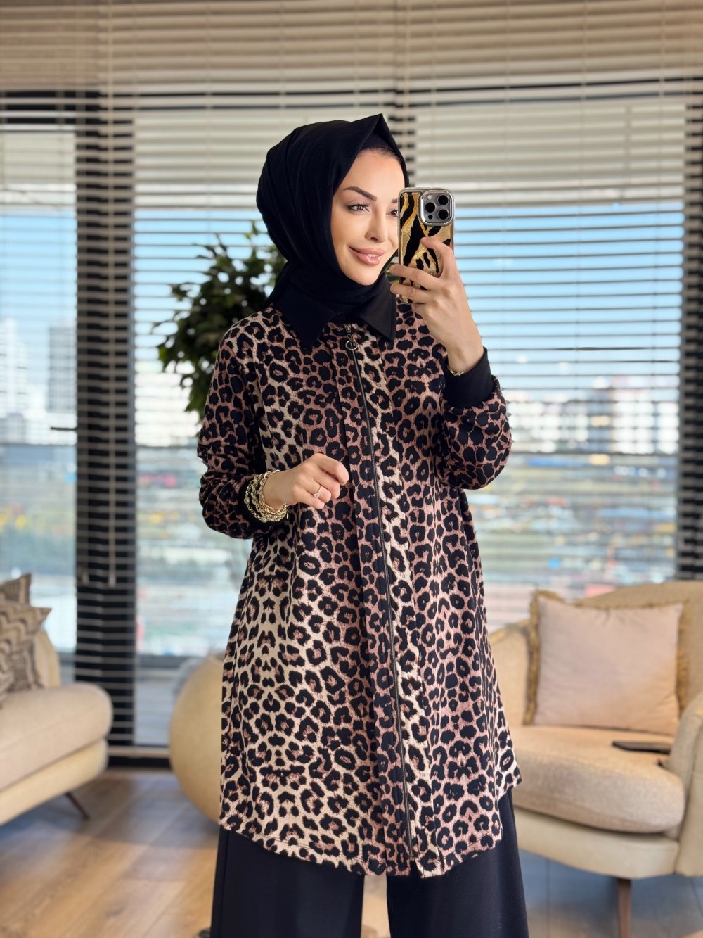 26611 Leopar Desenli Fermuarlı Kap Siyah Kahve