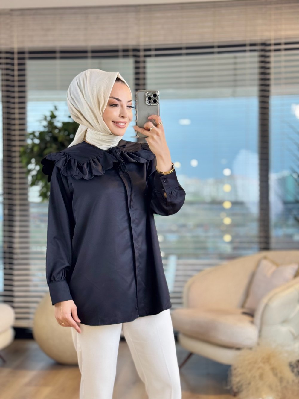 2918 Yakası Fırfırlı Detaylı Gömlek Siyah