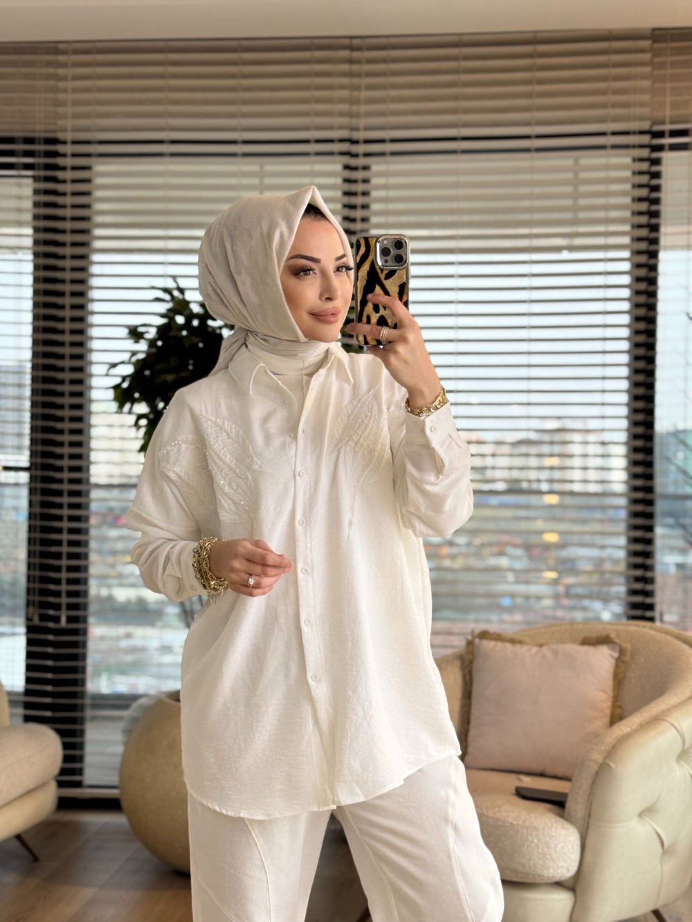 3226 Nakış Üstü Taş İşlemeli Gömlek Ekru