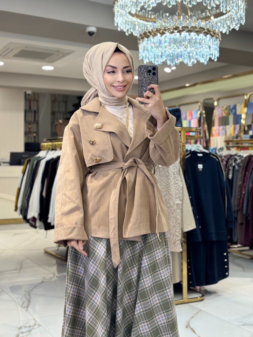 32405 Metal Düğme Aksesuarlı Kısa Trenç Bej