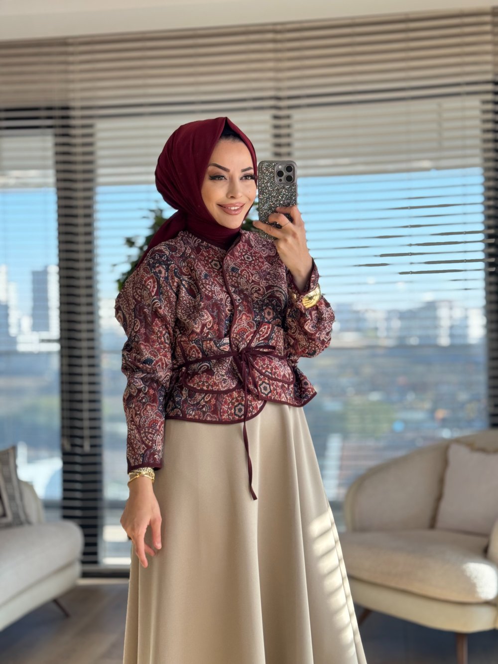 32447 Otantik Desen Önden Bağlamalı Ceket Bordo