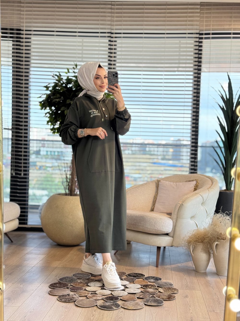 33744 Baskılı Kapşonlu Cepli Elbise Haki
