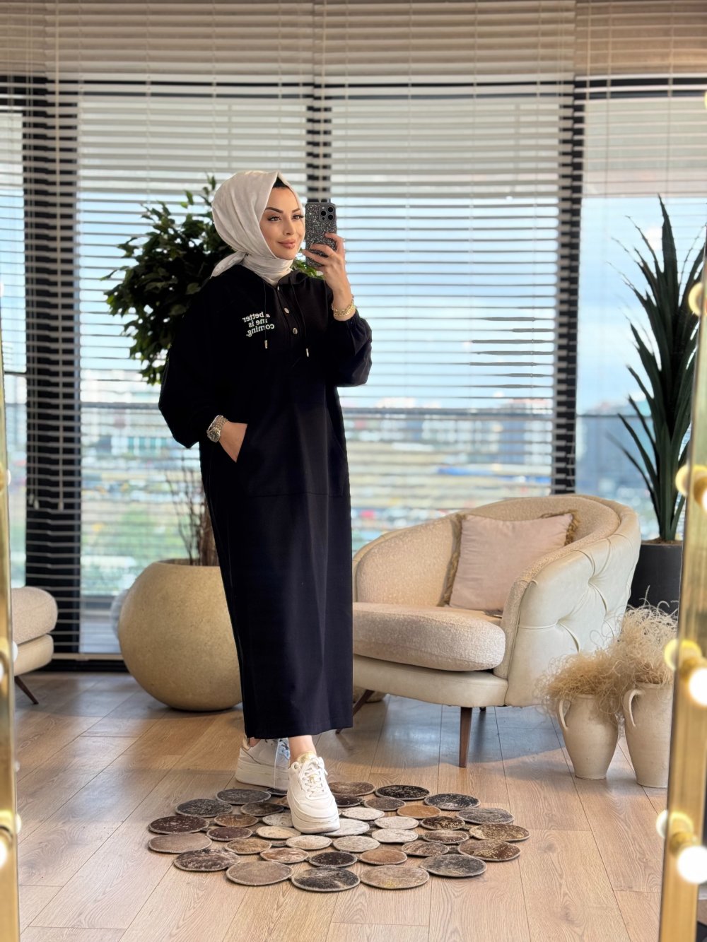 33744 Baskılı Kapşonlu Cepli Elbise Siyah