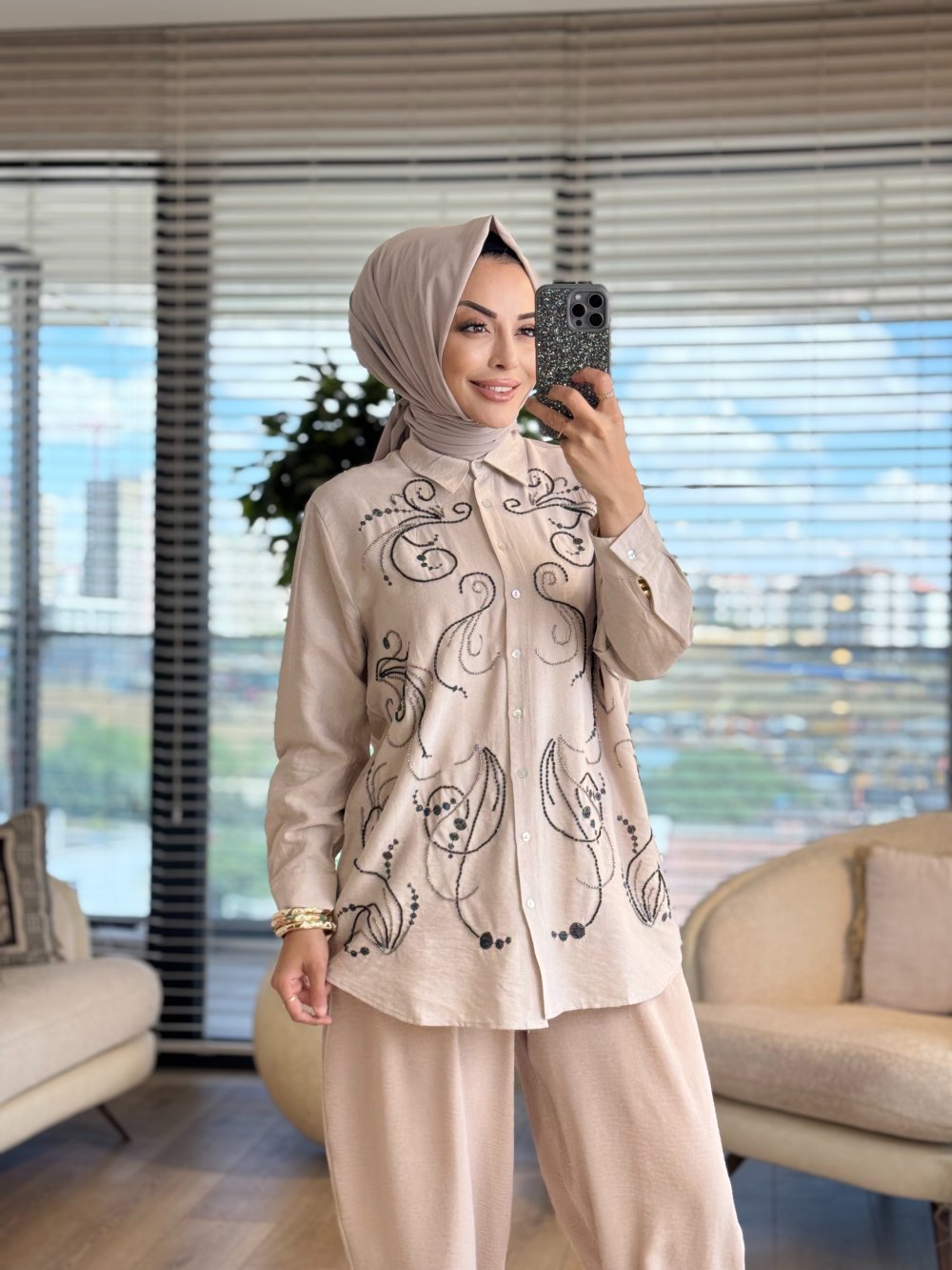 33962 Önü Boncuk Ve Taş İşlemeli Gömlek Açık Bej