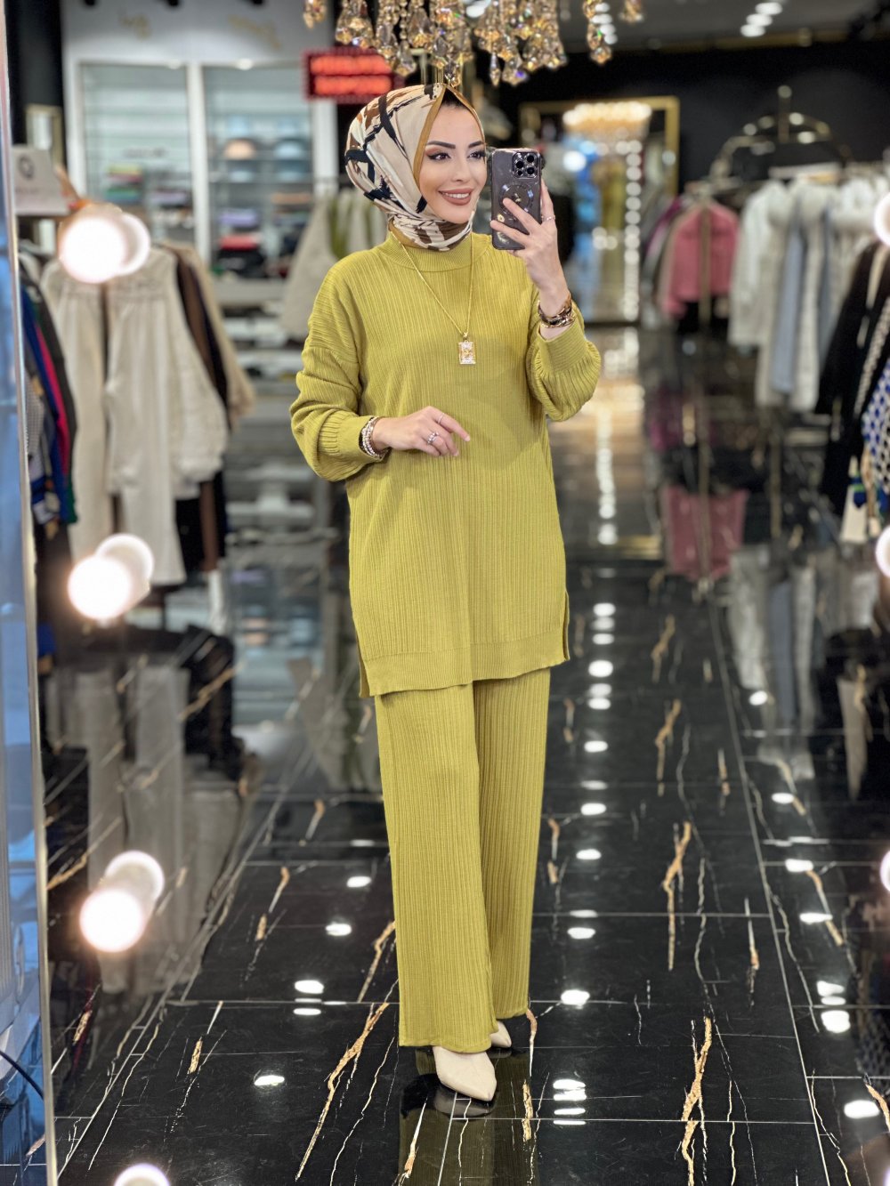 3444 Nopen Fitilli Triko Pantolon Takım Yağ Yeşili