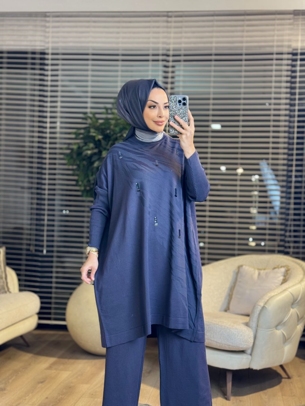 3508 Üst Pul Nakışlı Kendinden Desenli Triko Tunik Antrasit