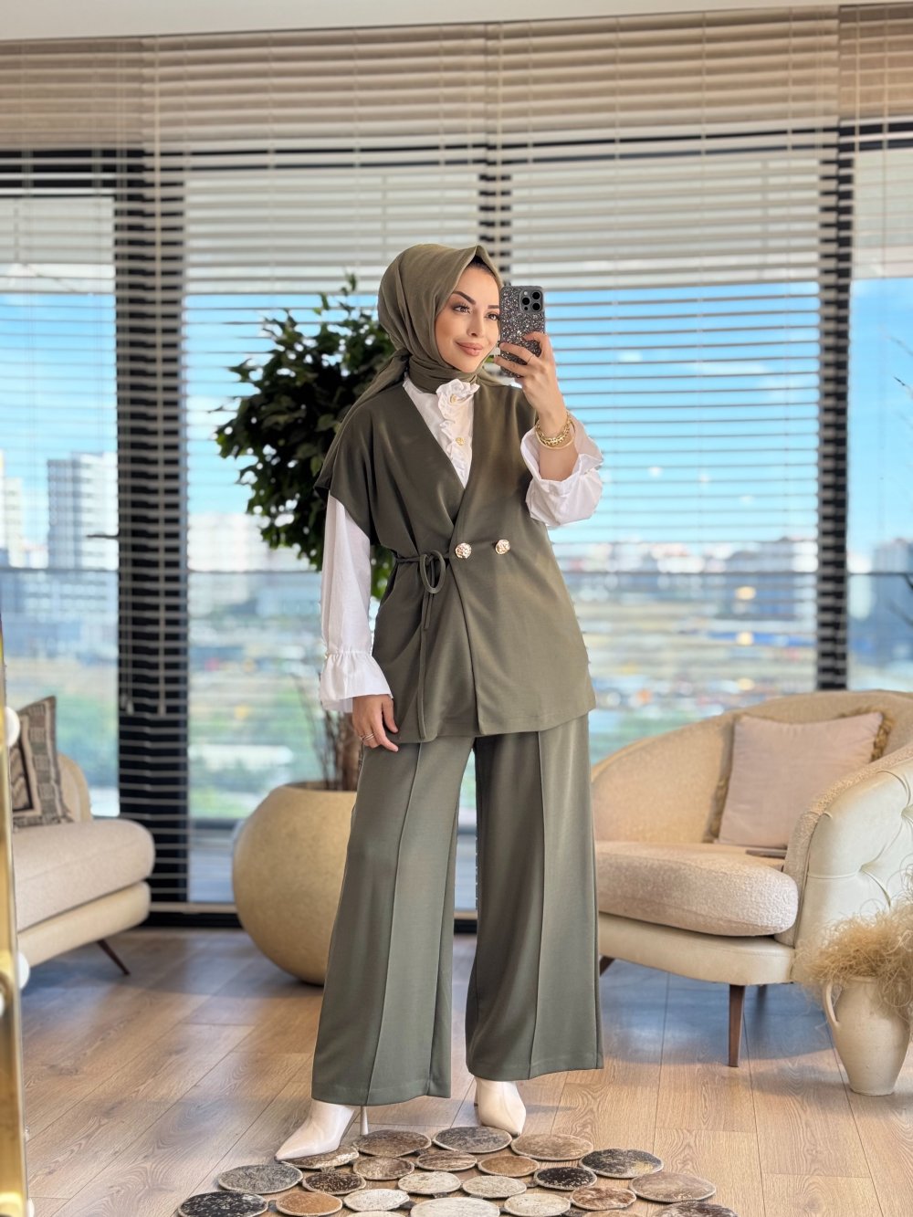35717 Kruvaze Yelekli Pantolonlu Takım Haki