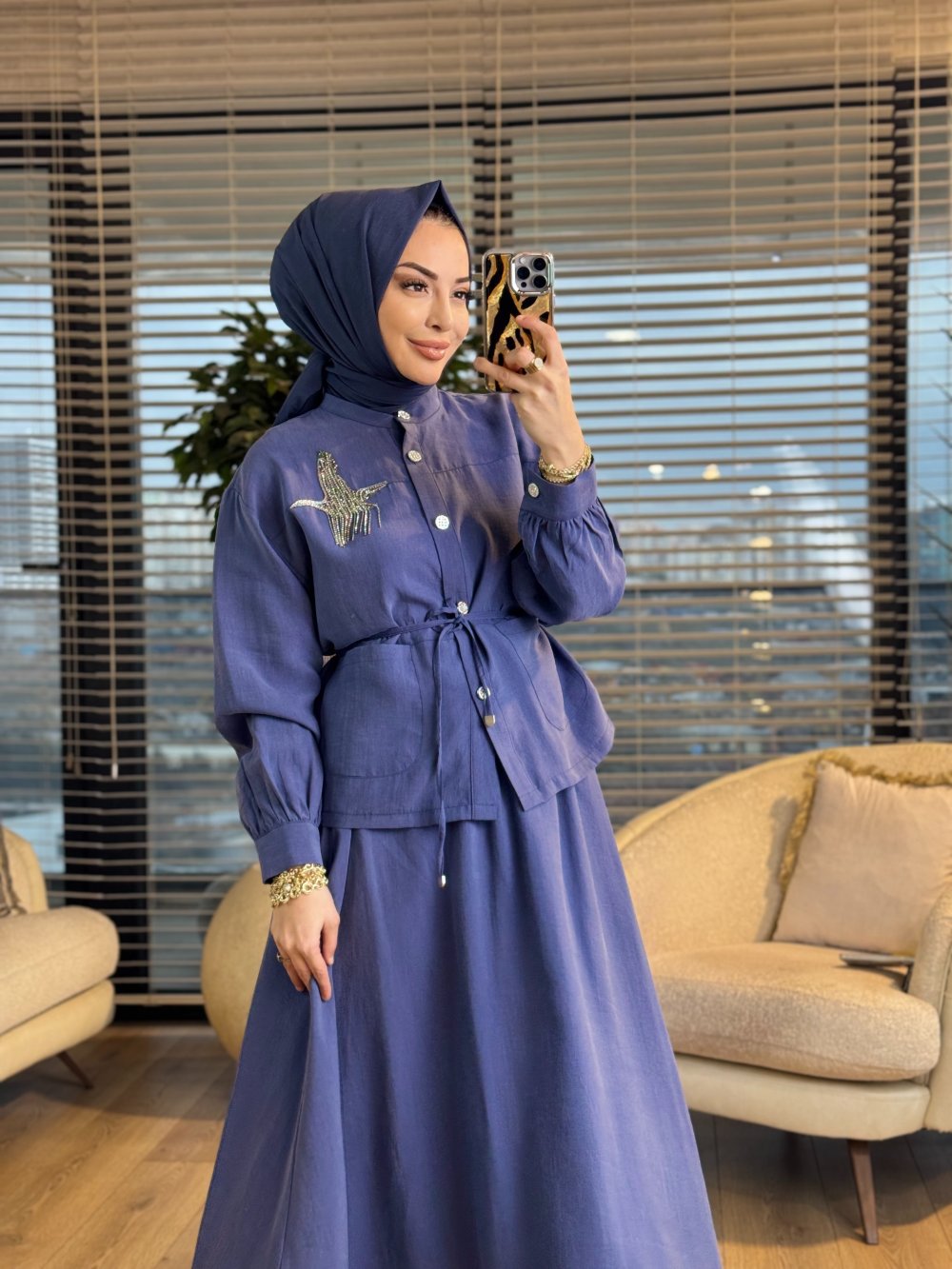 4443 Sol Gögüs Kuş İşli Takım İndigo