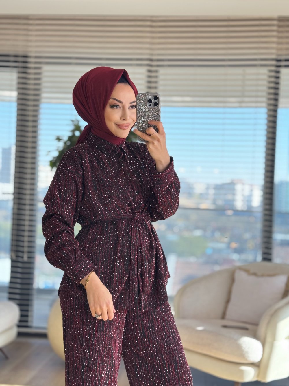 5249 Üstü Simli Taş Baskılı Takım Bordo