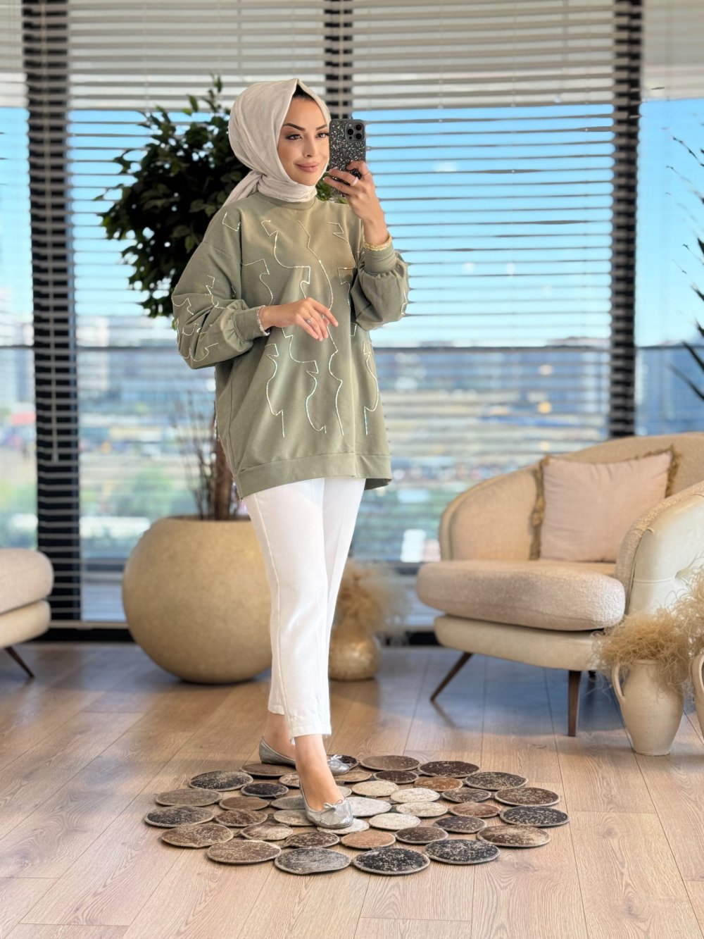 5521 Önü Kolu Çubuk Boncuk İşli Tunik Çağla