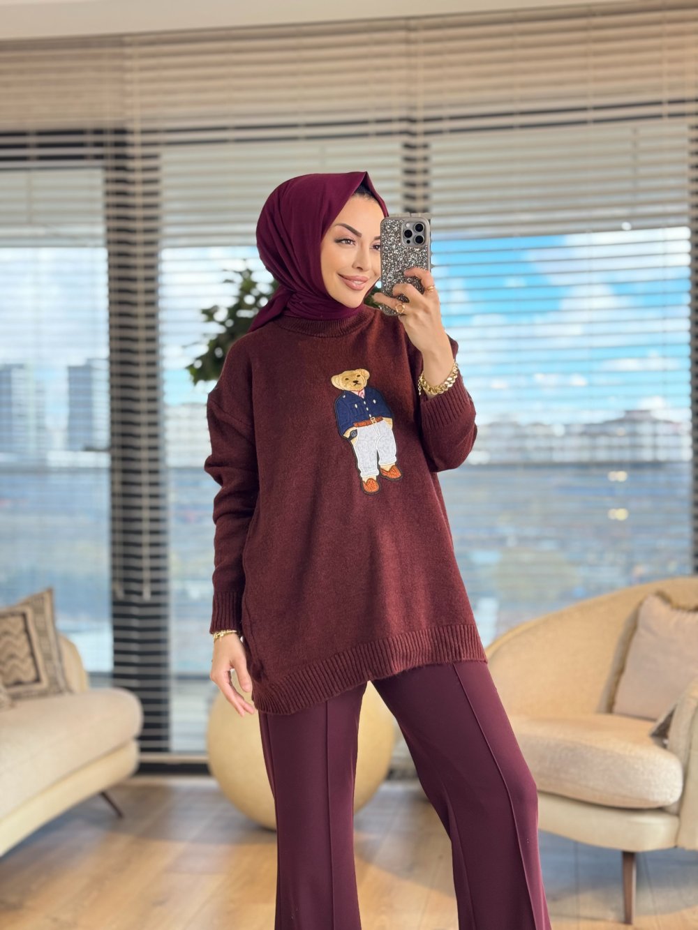 6505 Önü Ayıcık Nakışlı Triko Tunik Bordo
