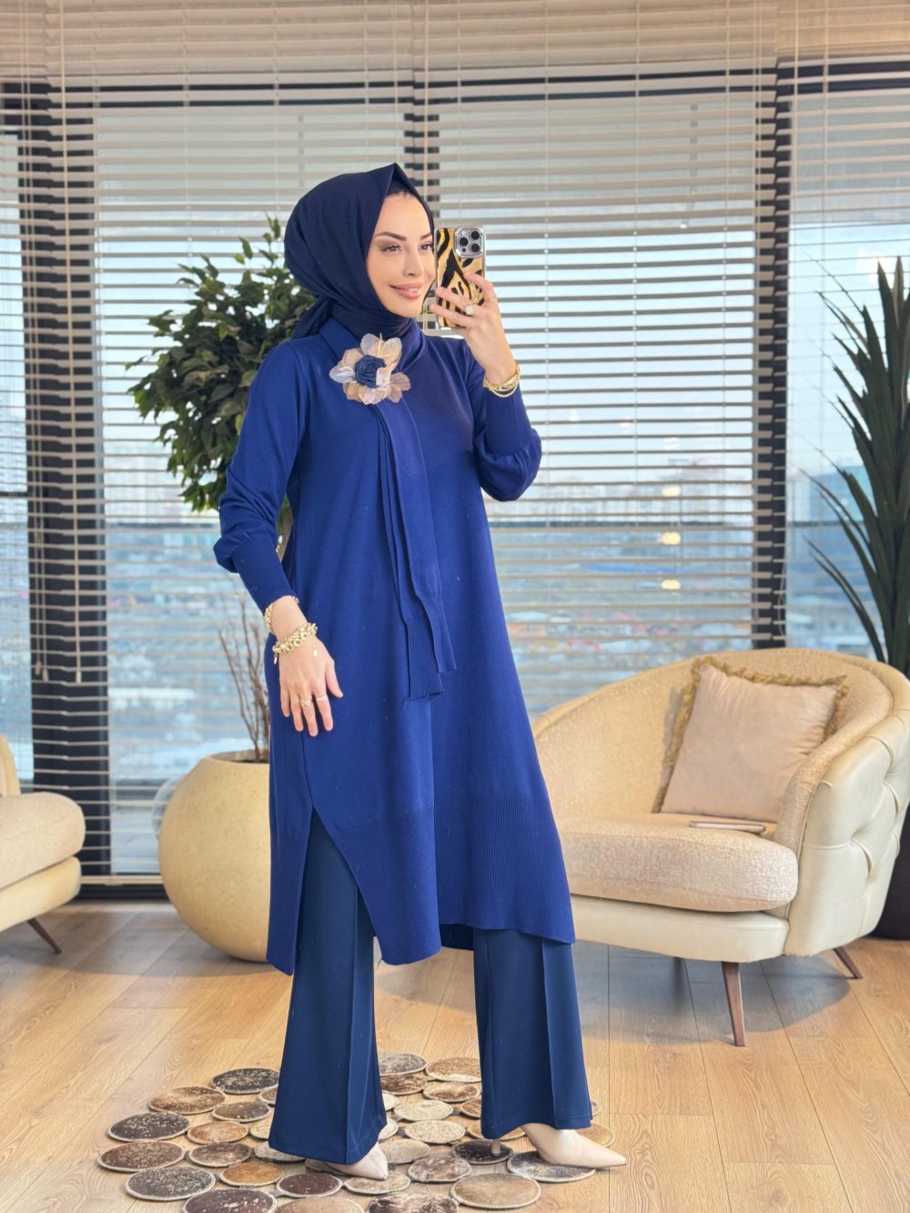 6795 Atkılı Çiçek Broşlu Uzun Triko Tunik Lacivert