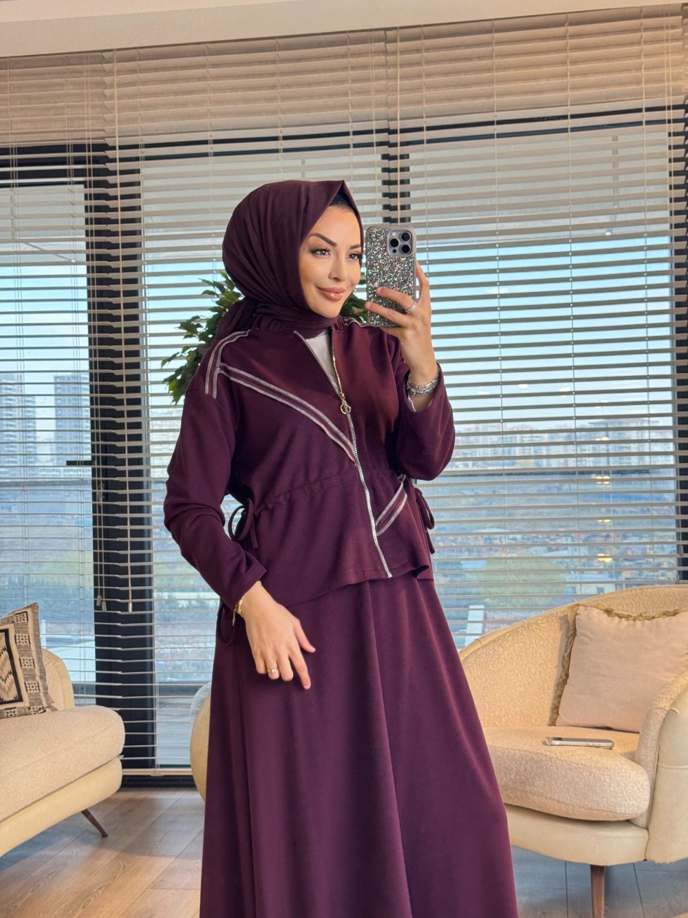 72020 Dikiş Detaylı Fermuarlı Etekli Takım Mürdüm