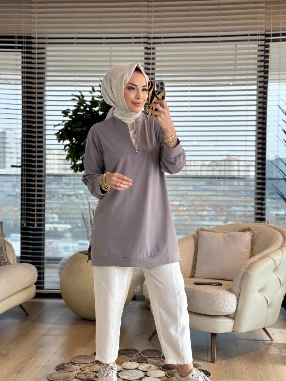 7474 Oysho Patı Fermuarlı Tunik Gri