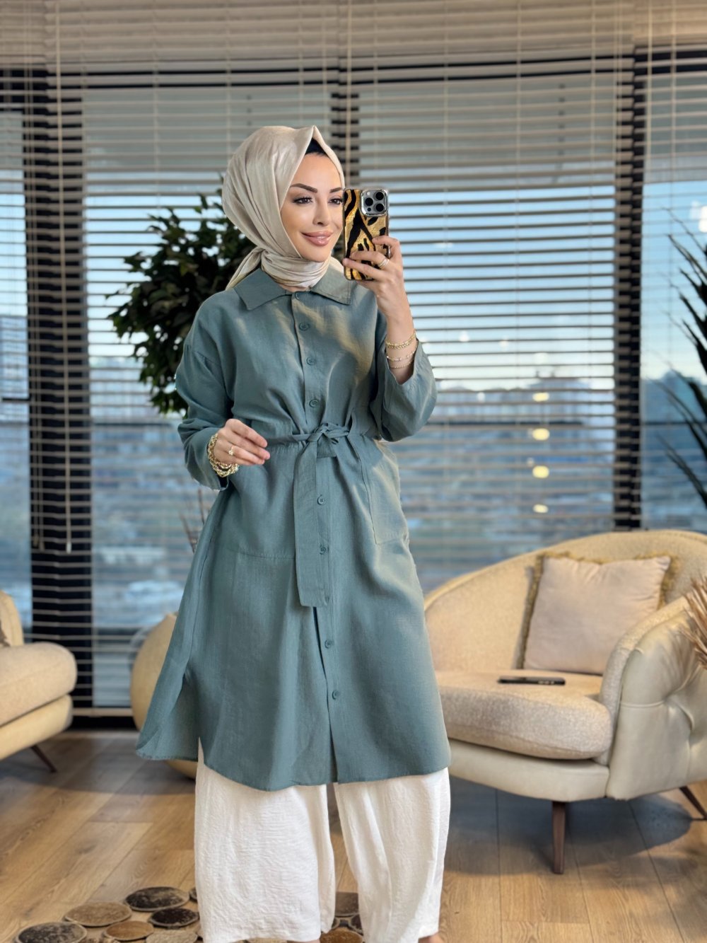 7501 Ön Düğmeli Kuşaklı Uzun Tunik Haki