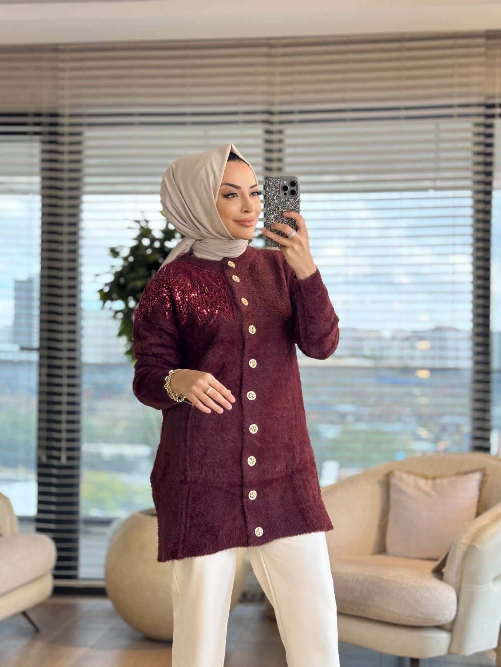 7701 Angora Boncuklu Oversize Hırka Bordo