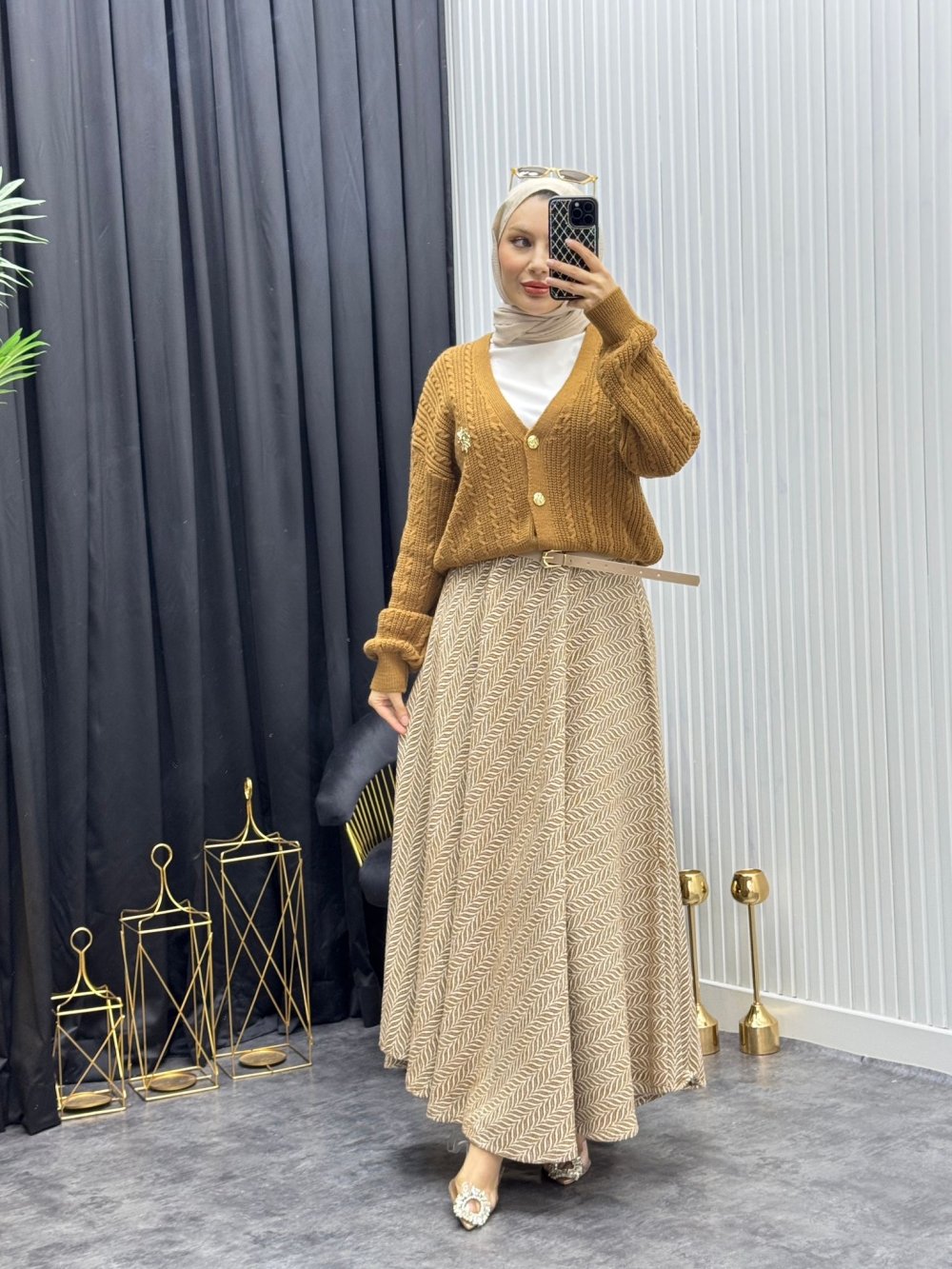 hırka etek olmak üzere ikili takımdır hırka broş detaylıdır kemer ürüne dahildir