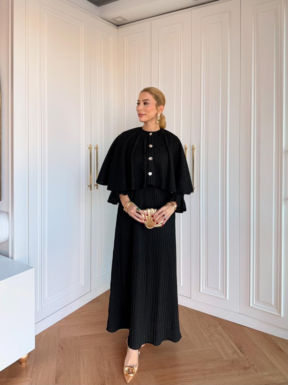 Elbise Çıkarılabilir Düğme Detaylı Pelerinlidir.