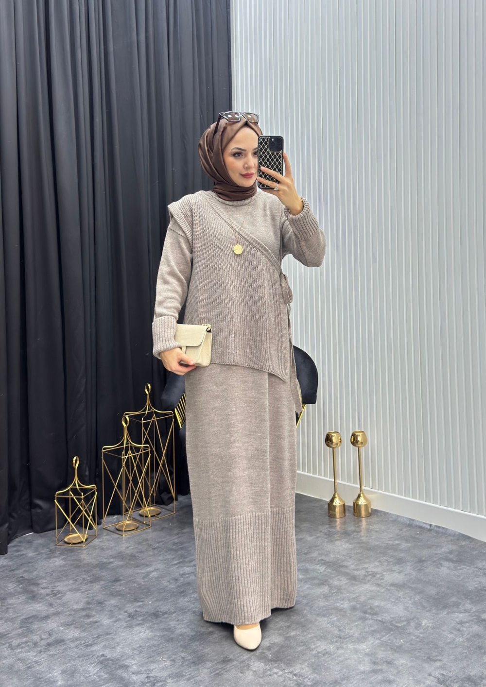 yelek elbise olmak üzere 2 parçadan oluşmaktadır yelek bağcıklıdır elbise