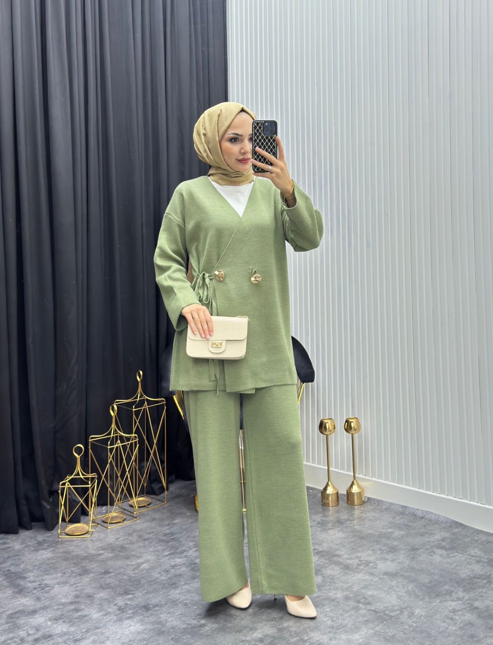 tunik önden düğmeli ve bağcıklı pantolon beli lastiklidir