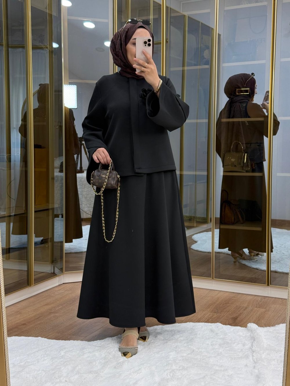 Çiçek Broş Detaylı Scuba Etekli Takım Siyah