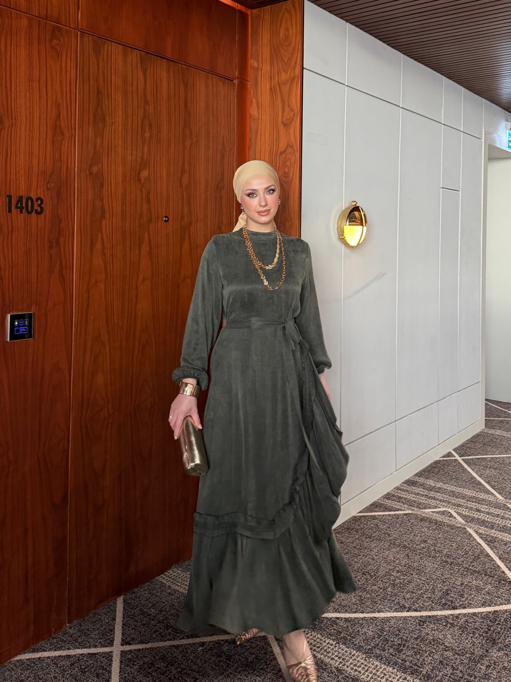 Elbise Etek Ucu Asimetrik Fırfır Detaylıdır.