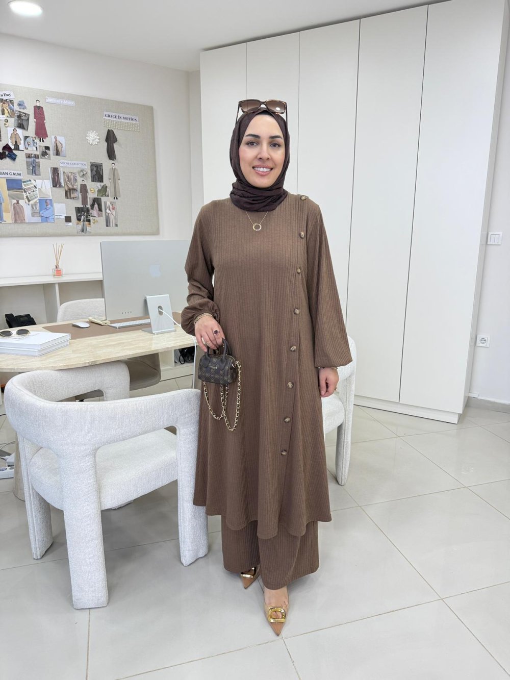 Çubuk Düğme Detaylı Takım Kahverengi