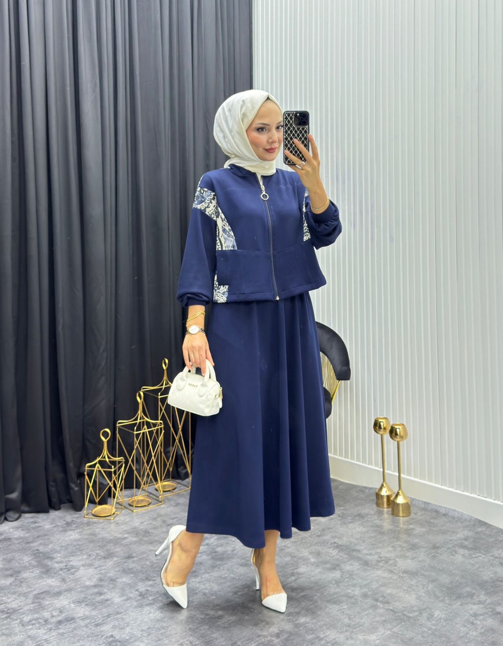 Ön kısmı ve omuzları desenli ve önden çift ceplidir,