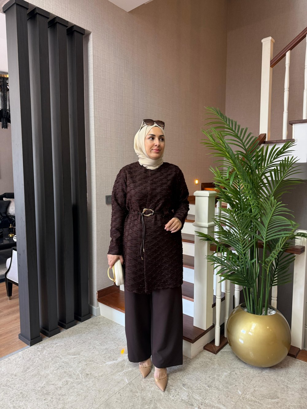 Ceket tül işleme detaylıdır, boy uzunluğu 85 cm’dir. Seyyar deri gold tokalı kemeri bulunmaktadır.